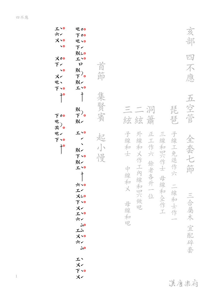 南管指、譜、曲三大類均為固定調,惟「四不應」為低大二度之變奏曲。全曲分七個樂章,一至六樂章雖是簡單樂句變化摸進而成,但漸高音程豐富了旋律表情,每段樂章曲尾再度落入「原曲重複」之曲式,可見作曲者萬變不離其宗之嚴謹。改弦易徹移宮轉調之手法,堪謂六朝以降中國音樂家欲突破傳統「清商三調」之創新傑作。因為仍循五音制故成變奏曲,全曲以疊拍(1/2拍)組成,樂韻徐進如風之清幽,如雲之飄逸,予人仙風道骨之感。